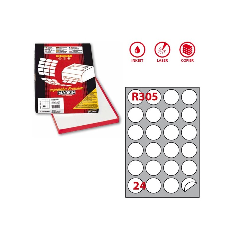 Scatola da 100fogli da 21x29,7cm (A4) di etichette in carta bianca adesive permanenti nel formato. Stampabili con stampanti inkjet, laser e fotocopiatori. 24 etichette tonde per foglio.