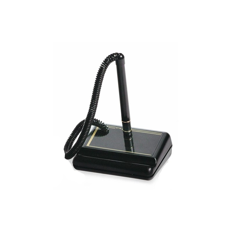 Stiloforo composto da penna a sfera (inchiostro nero) e portapenna rettangolare in plastica. Penna collegata alla base tramite una molla a spirale. Base di colore nero (9x7 cm) con rigatura in oro. Ricaricabile con refill cod. 81866.