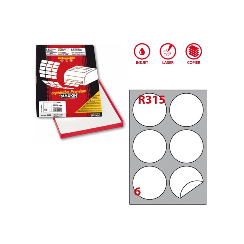 Scatola da 100fogli da 21x29,7cm (A4) di etichette in carta oro adesive permanenti nel formato. Stampabili con stampanti laser. 6 etichette tonde per foglio.