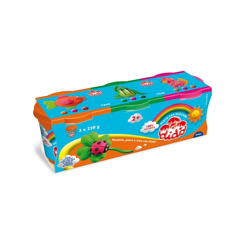 Pasta per giocare morbida, fatta con ingredienti naturali. E' innocua e non macchia. 3 barattoli da 220gr nei colori erde-arancio-magenta.