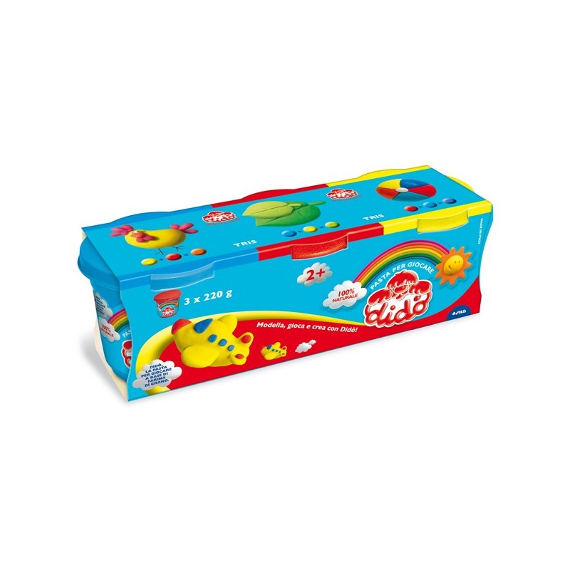 Pasta per giocare morbida, fatta con ingredienti naturali. E' innocua e non macchia. 3 barattoli da 220gr nei colori giallo-magenta-blu perlato