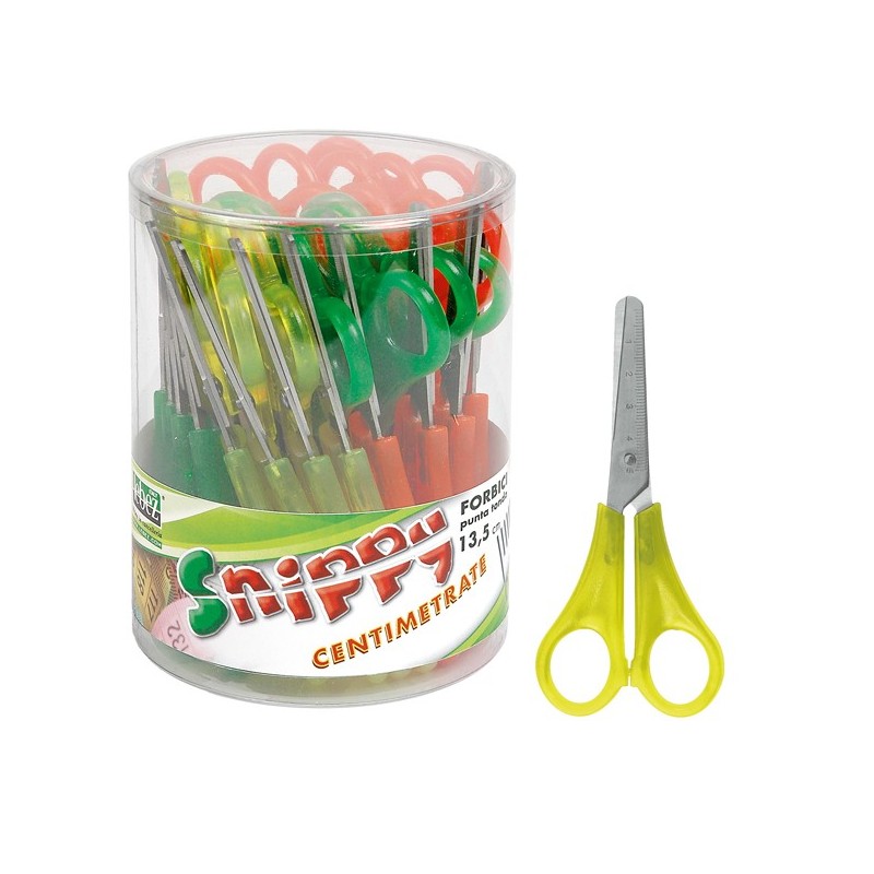 Forbici centimetrate Snippy per bambini mancini con lama in acciaio inox dalla punta arrotondata. Confezionate in barattolo da 24 pezzi.