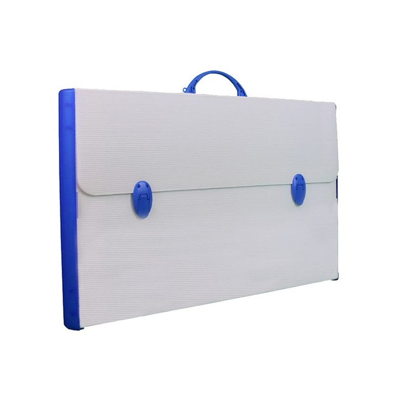 Valigetta in polipropilene alveolare con fianchi di rinforzo in polipropilene rigido. Chiusura doppia. Maniglia e chiusura in plastica antiurto in colori assortiti.