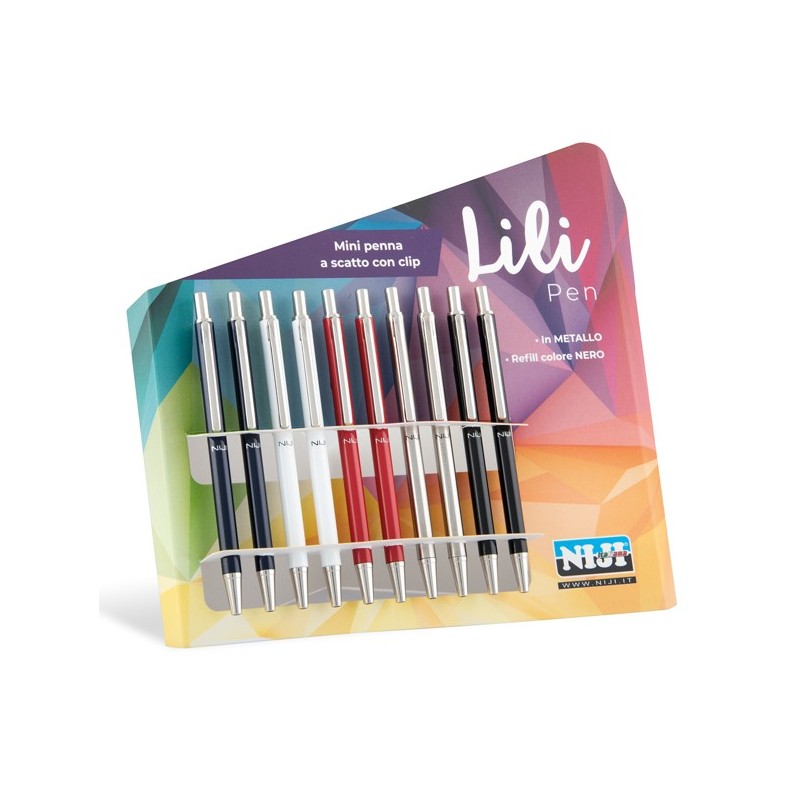 Mini penna a sfera con meccanismo a scatto. In metallo in colori assortiti, Lunghezza 10cm. Ricaricabile con refill 1241. Ideale per agenda. Tratto 0,5mm