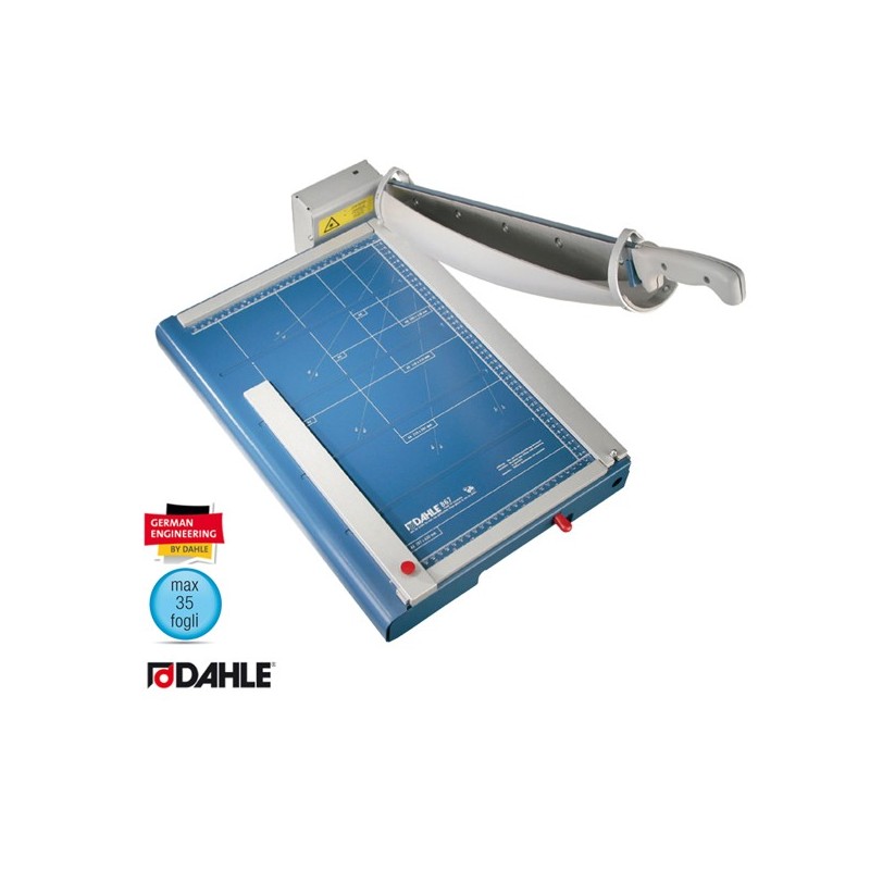 Taglierina a leva per formati A3. Luce di taglio 460mm (A3). Capacità di taglio 35fogli (3.5mm). Dimensione piano: 510x348cm. Pressino automatico bloccabile. Marginatore posteriore con guida di scorrimento. piano prestampato. Squadre laterali graduate. Piano sagomato. Paramano rotante di sicurezza.