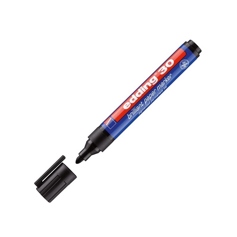 Marcatore indelebile brillante universale specialmente studiato per scrivere su carta e cartone, ma idoneo anche per scrivere su plastica, metallo e vetro. Inchiostro pigmentato a base d'acqua che non passa la carta. Punta tonda 1,5-3,0mm. Colore: nero.