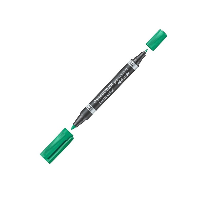 LUMOCOLOR PERMANENT DUO 348. Pennarello con doppia punta in fibra: da 0,6mm e da 1,5mm. Inchiostro a base d’alcool senza xylolo e toluolo. Airplane-safe. Brevettato DrySafe (non secca se lasciato per alcune ore senza cappuccio). Ricaricabile con riattivatore 488-88.