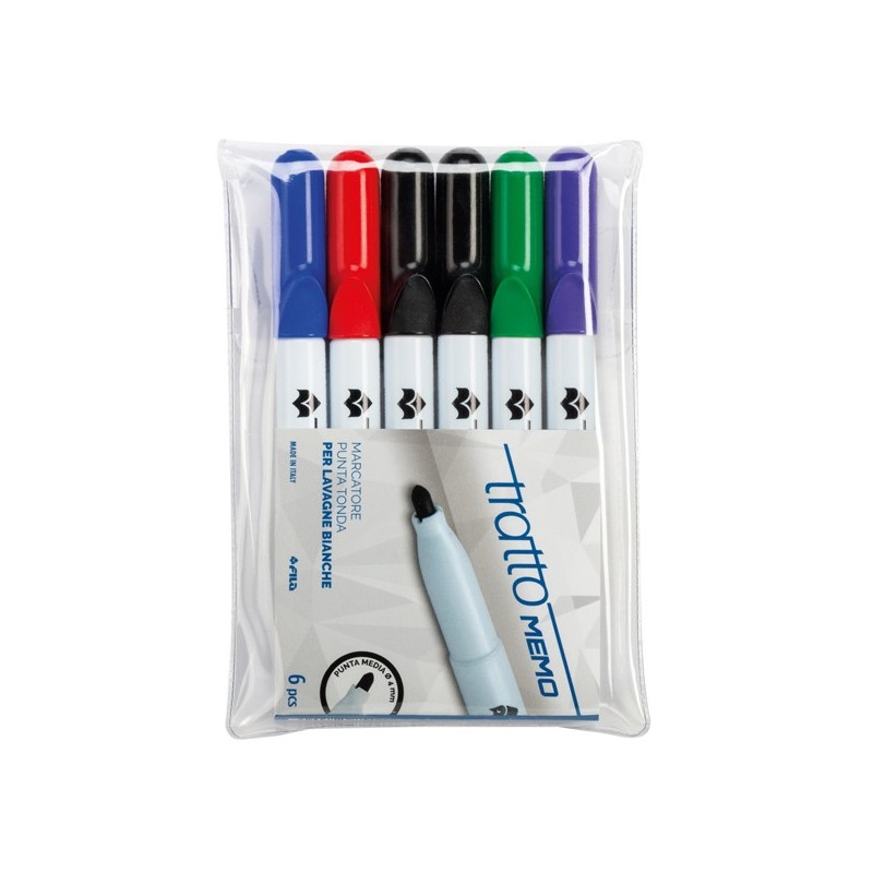 Marcatore punta tonda 4mm con inchiostro cancellabile a secco per lavagne bianche. Colori brillanti e ottima cancellabilità. Odore neutro. Astuccio da 6 pennarelli in colori assortiti: 1x blu, 1x rosso, 1x verde, 1x viola, 2x nero.