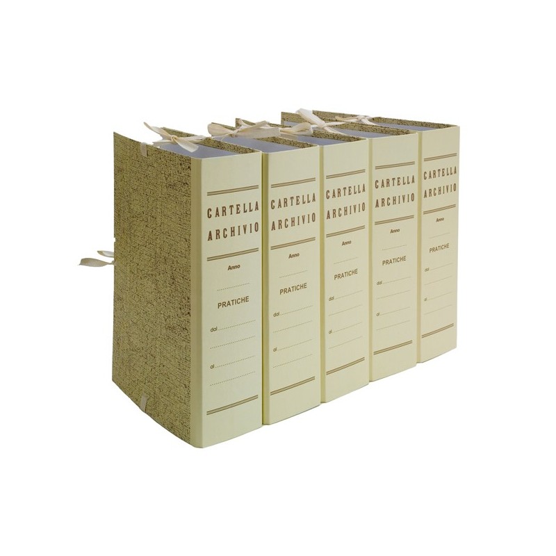 Cartella archivio con 3 legacci incollati. Realizzate in cartone rivestito con carta litografata iuta. Legacci a fettuccia fortemente fissati con collante. Formato 35x25cm. Dorso 20cm. Confezione da 25 faldoni.