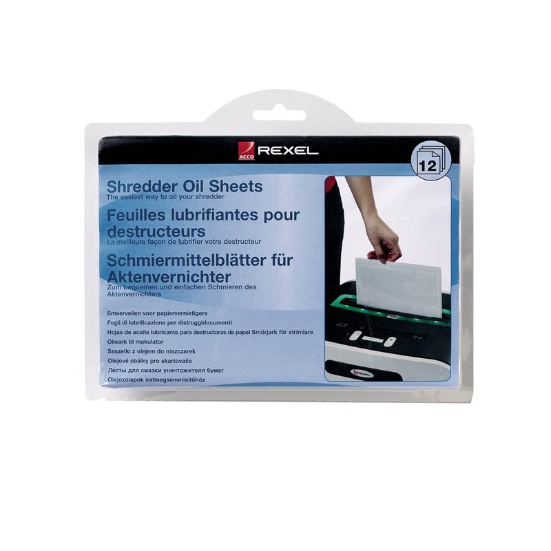 Ideati per prolungare la vita dei distruggidocumenti, i fogli lubrificanti sono il mezzo più semplice per distribuire la corretta quantità di olio ogni volta. Confezioni da 12fogli azzurri ed utilizzabili su tutti i modelli di distruggidocumenti senza autolubrificazione.