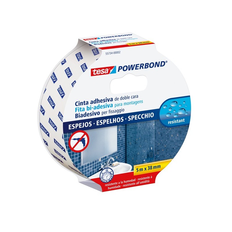 Nastro biadesivo con forte tenuta. E’ stato studiato specificamente per fi ssare piccoli oggetti. Resistente all’umidità. Sostiene specchi massimo 70x70cm - 4mm di spessore.