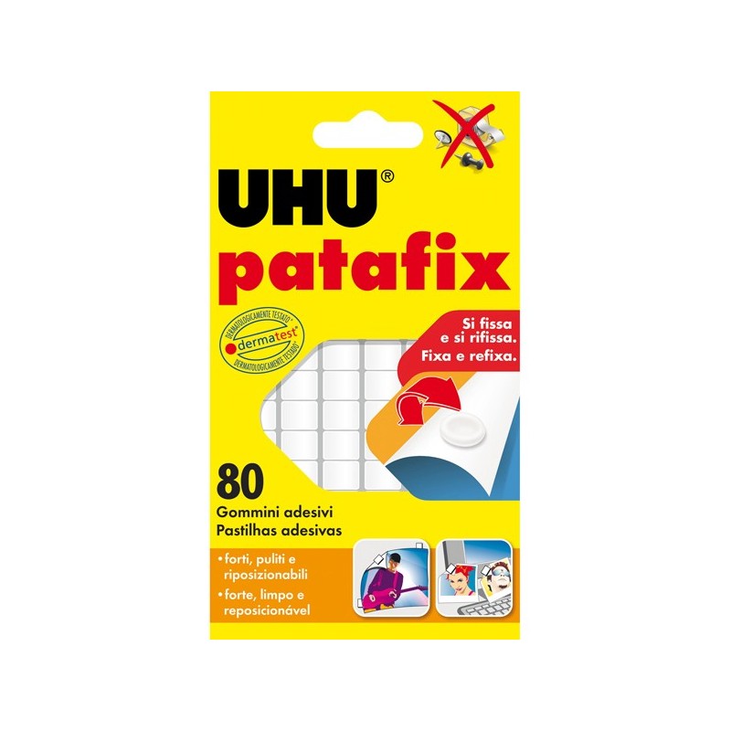 Blister da 80 gommini bianchi adesivi Patafix removibili e riutilizzabili infinite volte. Ideali per fissaggi temporanei, veloci e puliti di piccoli oggetti. È l’alternativa a chiodi, colla, puntine e nastri adesivi. Utilizzabile su varie superfici come pareti, porte o mobili. Dermatologicamente testati, sono costituiti per il 75% da materiale di origine naturale.