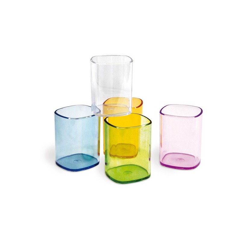Portapenne trasparente colorato di spessore elevato e ottima stabilità. Colore trasparente. Ideale per contenere penne, matite e altri strumenti di scrittura. Materiale antiurto. Formato 65x65x95mm.