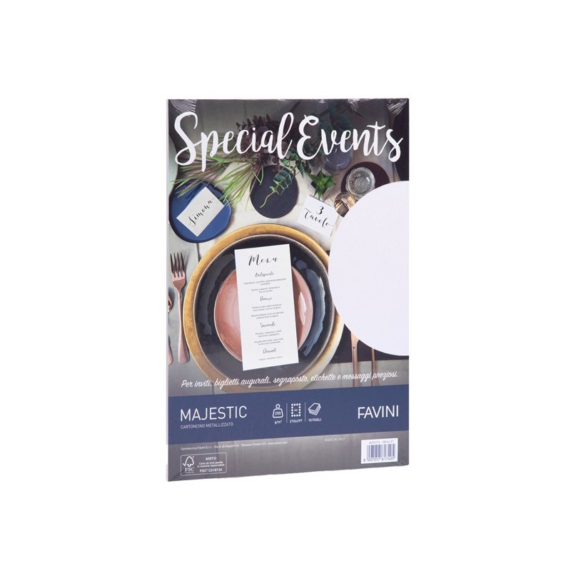 Cartoncino da 250gr metallizzata Majestic Favini dai riflessi brillanti e pregiati. Utilizzabili per scrittura manuale, inkjet, laser e copy. Formato 21x29,7cm.