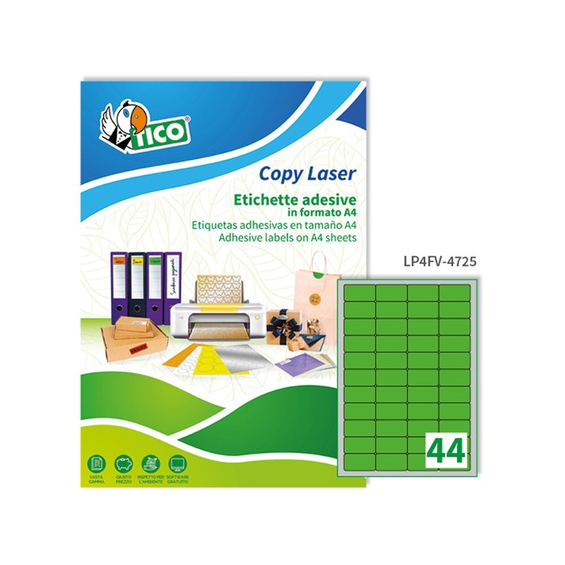 Confezione da 70 fogli nel formato A4 in carta verde fluo adesiva permanente. Ogni foglio contiene 44 etichette rettangolari con angoli tondi nel formato 47,5x5,5mm. Stampa inkjet, laser e copy. Prodotte in Italia.