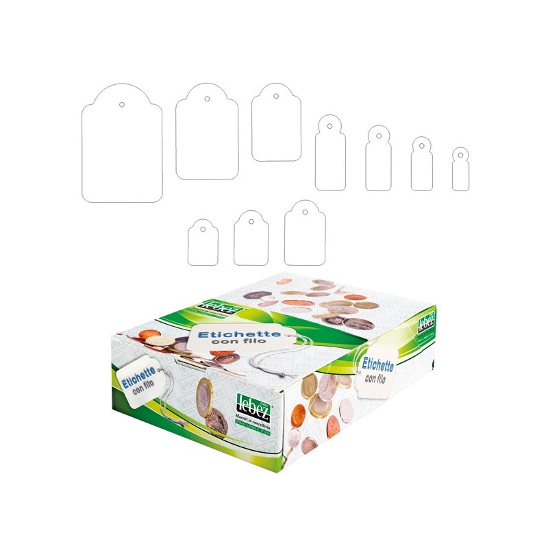Scatola contenente 1000 cartoncini sagomati con filo per etichettatura a mano. Formato etichetta 7x19mm.