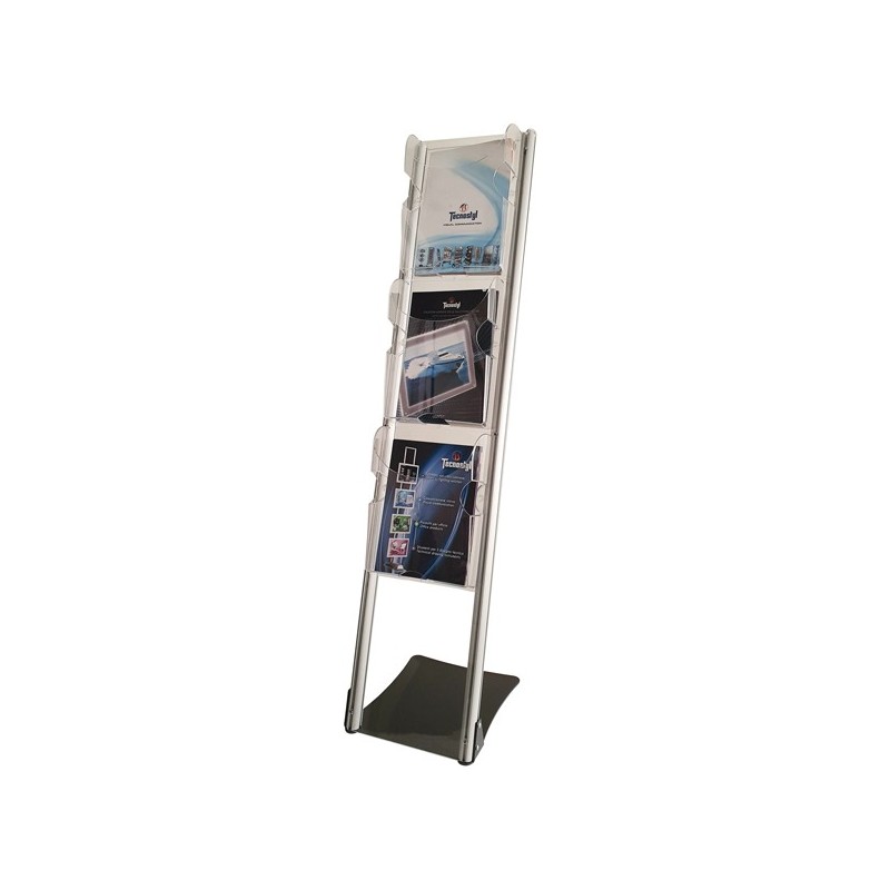 Espositore della linea VISION con vaschette Ice nel formato A4 (26x9x33 cm) in PS altamente trasparente e base richiudibile. Applicazione con bottoni a fissaggio rapido su pannello in acrilico (dimensione cm 31x134) personalizzabile nella parte inferiore. Dimensione: L32 x P 42 x H 132cm.