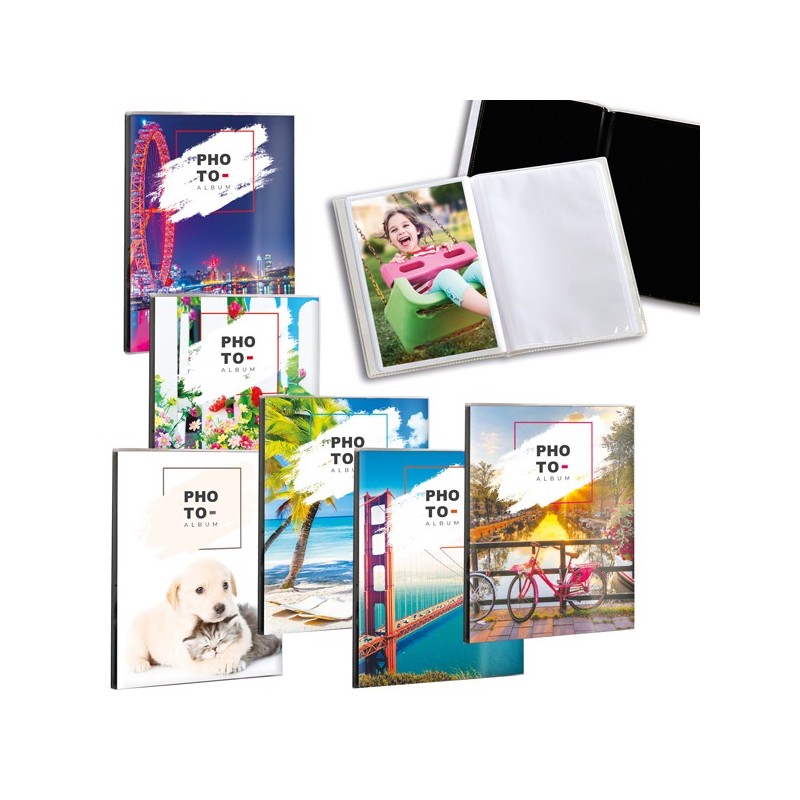 Album portafoto a busta saldati sul dorso. Confezioni con copertine assortite con buste bianche e nere. 24 foto da 10x15cm. Formato 12,5 x 16,5cm.