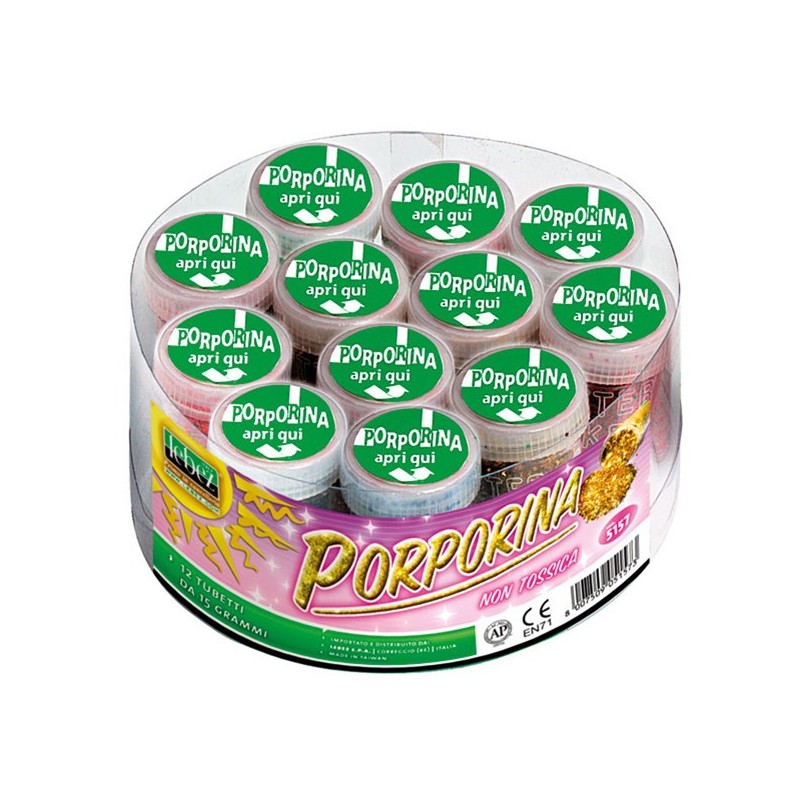 Barattolo contenente 12 tubetti da 15gr di glitter nei colori oro, argento rosso e blu.