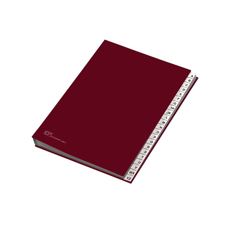 Classificatori alfabetico con robusta copertina in dermoide. Intercalari in tenace cartoncino. Scala in plastica serigrafata. Dorso a soffietto. Formato utile 24x34cm.