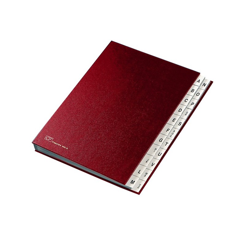 Classificatori alfabetico con robusta copertina in dermoide. Intercalari in tenace cartoncino. Scala in plastica serigrafata. Dorso a soffietto. Formato utile 24x34cm.