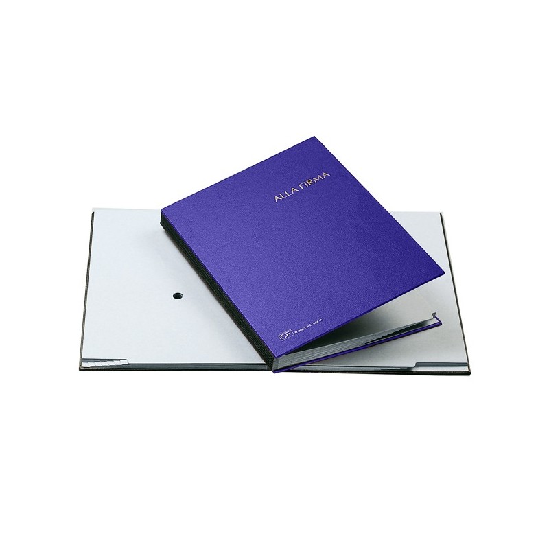 Libri firma in robusta copertina in cartone rivestita in dermoide. 14 intercalari in resistente cartoncino assorbente accoppiato. Dorso a soffietto rinforzato in imitlin. Formato utile 24x34cm.