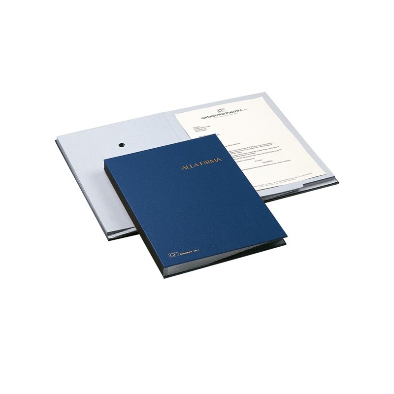 Libri firma in robusta copertina in cartone rivestita in dermoide. 18 intercalari in resistente cartoncino assorbente accoppiato. Dorso a soffietto rinforzato in imitlin. Formato utile 24x34cm.