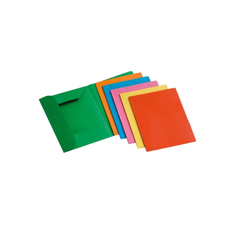 Cartelline 3 lembi in cartoncino da 200gr senza stampa. F.to 25x33cm. Confezione da 12 cartelline assortite in colori vivaci assortiti: rosso giallo verde azzurro fucsia arancio.