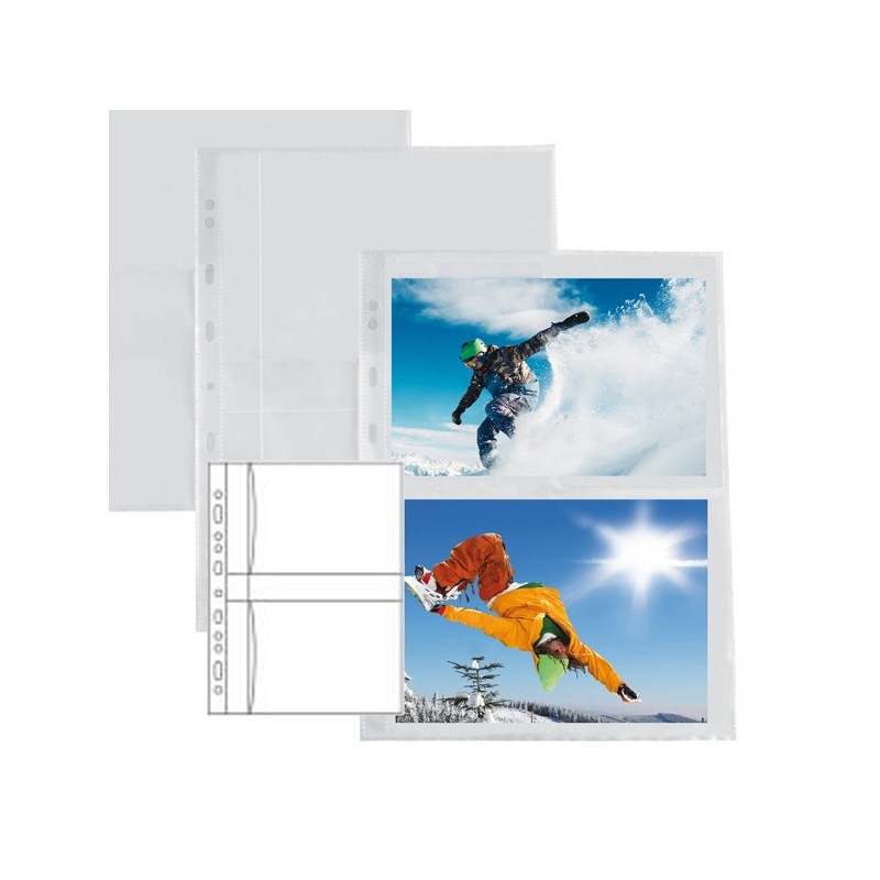 Buste in PP liscio con foratura universale per la raccolta di fotografie. Dotate di 2 tasche per lato da 13x18cm (Inserimento foto laterale) I due lati sono separati da un divisorio bianco. Formato busta 21x29,7cm.
