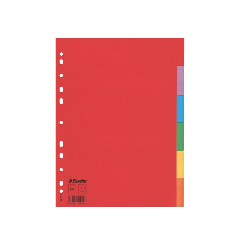 Intercalari in cartoncino riciclato (certificazione Blue Angel) da 160 gr. Dotati di 6 tacche neutre colorate (colori assortiti). Foratura universale. Formato A4.