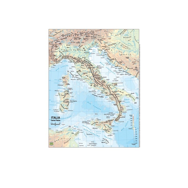 Cartina scolastica dell'Italia, formato A3 (297x420mm) plastificata. Un lato cartina fisica, un lato cartina politica.