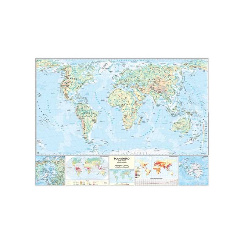 SBN: 978-88-8146-268-1 Scala: 1:30.000.000 Dim. chiusa: n.d. Dim. aperto: 132x99 cm Retro: Stampata su due lati (Fisico/politica) Plastificazione antiriflesso - Aste di supporto in plastica è una carta murale di grande formato, con plastificazione opaca antiriflesso e aste in plastica. La cartografia è basata sulla proiezione tripla di Winkel e rappresenta l'aspetto fisico della terra su un lato e quello politico dall'altro. L'uso dei colori è bilanciato per salvaguardare sia la brillantezza che la leggibilità della carta. Le città si distinguono per grandezza con una simbologia appropriata e in entrambe le versioni è curata la dizione italiana dei toponimi esteri. La parte fisica è completata dai riquadri dei poli, da alcune tavole tematiche riguardanti sismicità, clima, densità di popolazione e dal grafico dell'aumento mondiale della popolazione. La parte politica mostra le bandiere del mondo con i dati essenziali di tutte le nazioni.