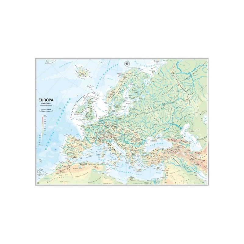 Cartina scolastica murale fisico/politica. Plastificazione antiriflesso . Aste di supporto in plastica. Scala 1:5.000.000. f.to 132x99cm