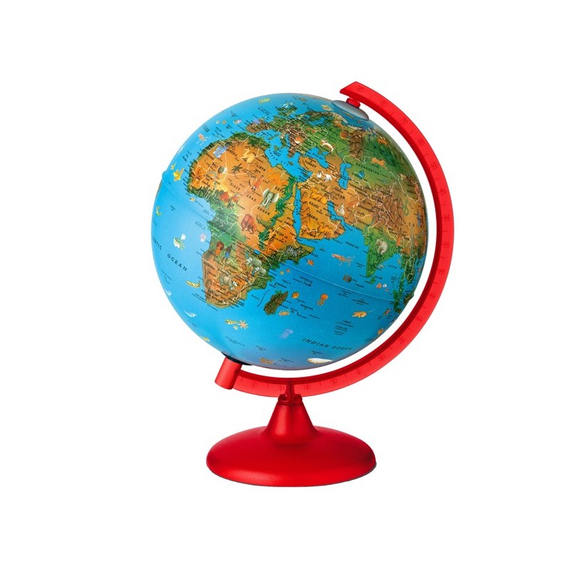 GLOBO GEOGRAFICO ILLUMINATO. CAVO ELETTRICO DI ALMENO 150CM (CONFORME ALLE NORMATIVE VIGENTI).CARTOGRAFIA FACILITATA CON ANIMALI CHE RENDE DIVERTENTE L'APPRENDIMENTO DELLA GEOGRAFIA. UTILIZZABILE ANCHE COME LAMPADA ANTI-PAURA. BASE E SEMI-MERIDIANO IN RESINA COLOR ROSSO. DIAMETRO 26CM (10") ALTEZZA 33CM.