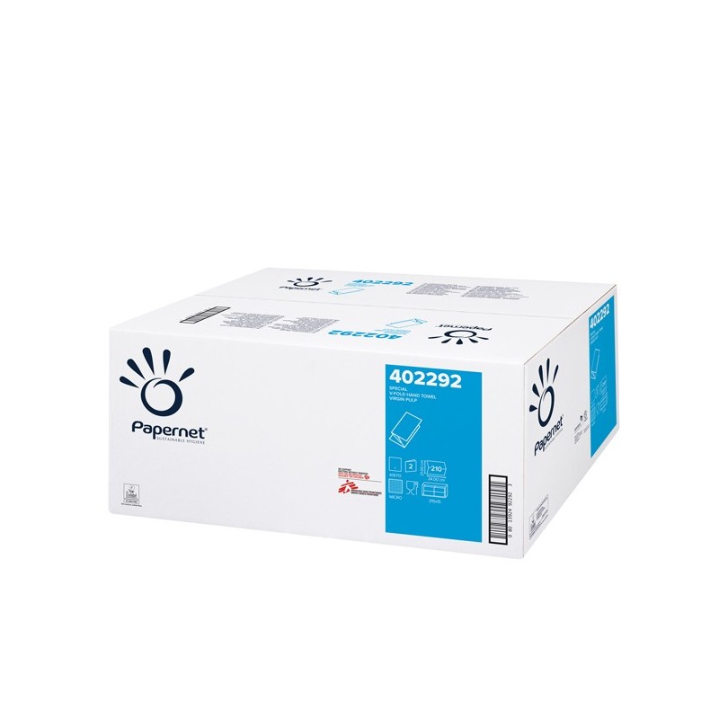 Asciugamani piegati a "V" realizzati in pura cellulosa, 210 fogli goffrati a onda. Il foglio fuoriesce ripiegato in due e la distribuzione avviene di foglio in foglio. Formato: 24x21cm.