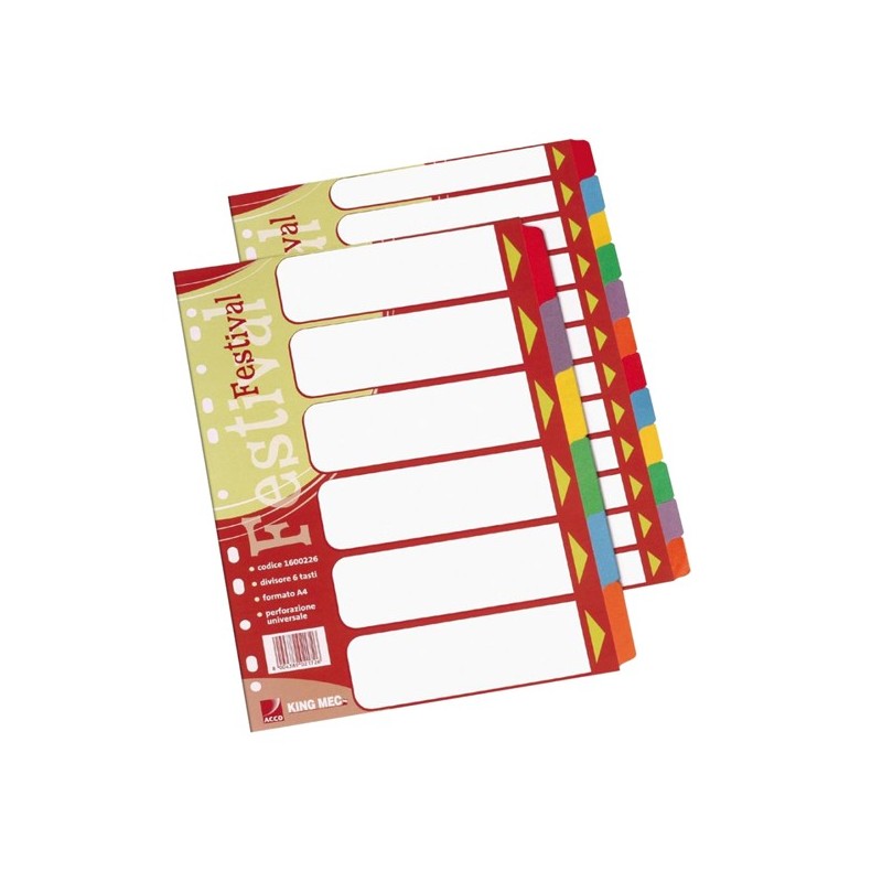Separatori in cartoncino da 140 gr dai colori vivaci e brillanti. Dotati di 12 tasti neutri e di indice frontale prestampato per una comoda classificazione dei documenti. Foratura universale. Formato A4.