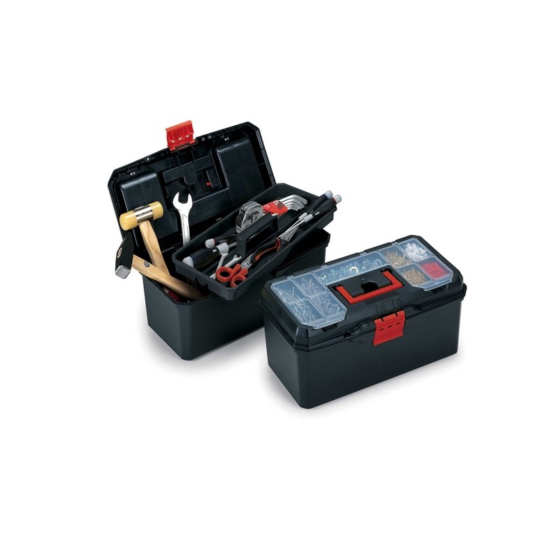 Valigetta portautensili in polipropilene nero con inserti gialli. Vassoio interno estraibile e organizer sul coperchio. Dimensioni: l 400 x p 210 x h 175mm. Peso 0.985kg.