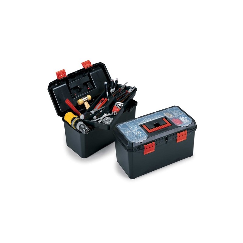 Valigetta portautensili in polipropilene nero con inserti gialli. Vassoio interno estraibile e organizer sul coperchio. Dimensioni: l 475 x p 240 x h 225 mm. Peso 1.6kg.