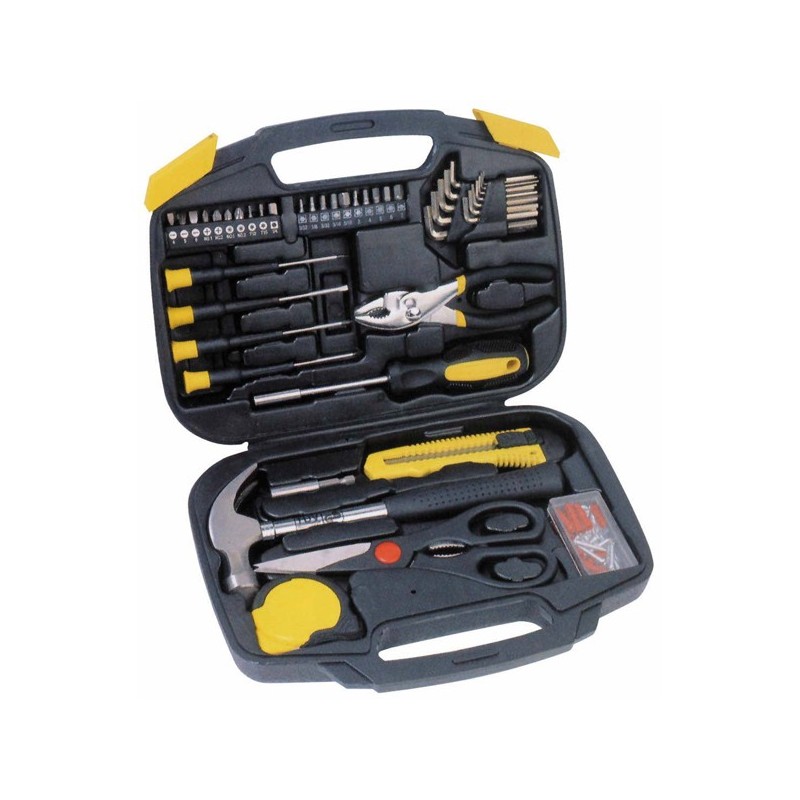 "Valigetta composta da 45 pezzi: 1 cacciavite portainserti, 20 inserti cr-v, 1 pinza con ganasce a slittamento 6"", 1 martello ad artiglio, 1 coltellino, 1 paio di forbici, 4 cacciaviti di precisione, 80 pz assortiti per il fissaggio, 1 metro a nastro 3mt, 12 chiavi esagonali. Adatto per piccoli lavori domestici e manutenzioni. Dimensioni 310x230x70mm."