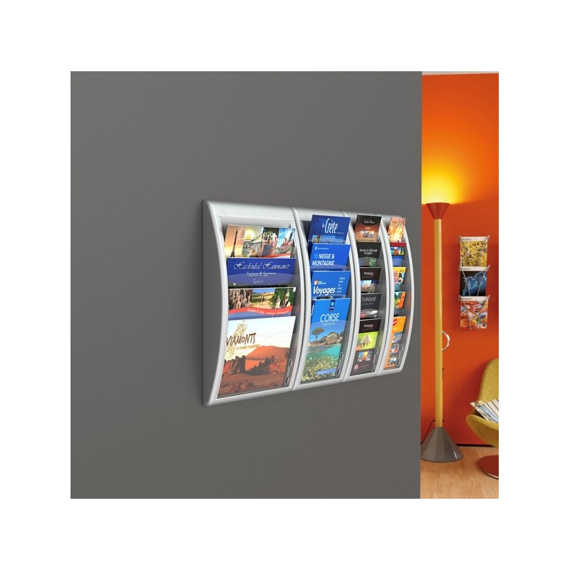 Elegante espositore da muro in polistirene. Disponibile per formati a4, a5 e 1/3 a4. I diversi moduli possono essere affiancati per creare pannelli espositivi. 5 tasche 1/3 a4 . Dimensioni: 18,1x9,5x65cm