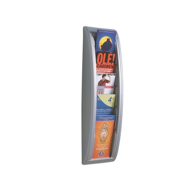 Elegante espositore da muro in polistirene. Disponibile per formati a4, a5 e 1/3 a4. I diversi moduli possono essere affiancati per creare pannelli espositivi. 5 tasche 1/3 a4 . Dimensioni: 22,8x9,5x65cm
