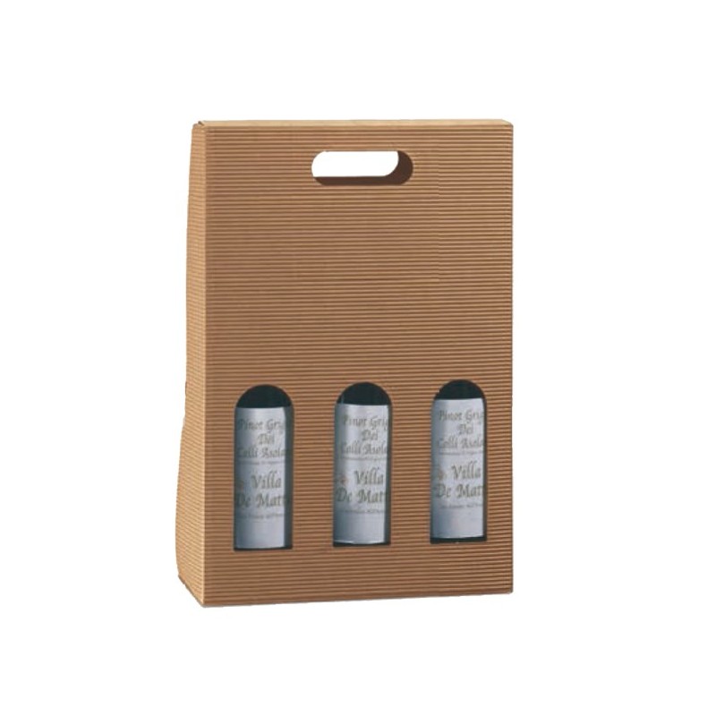 Scatola porta bottiglie in cartone Onda colore avana. Adatta per 3 bottiglie e dotata di comoda maniglia per il trasporto. Dimensioni: 27x9x38,5cm.