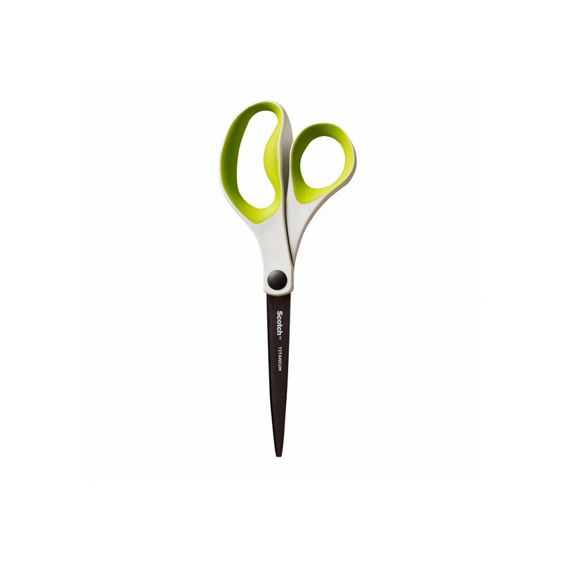 Forbici con lama in titanio, perno regolabile per il controllo della tensione. Impugnatura comfort in morbida gomma. Colori assortiti della gomma: verde acido, lilla, turchese. Lunghezza 20cm.