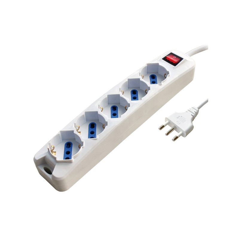 Presa multipla bianca con interruttore luminoso. Spina standard italiano 2P+T 16 A. 5 prese multistandard italiano/tedesco (bipasso/Schuko) 2P+T 10/16 A a ricettivitÓ multipla con alveoli schermati. Cavo: 3x1,0 mm¦, lunghezza 1,5 metri.