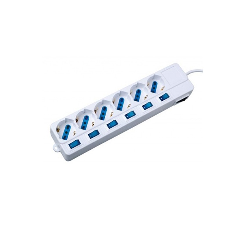 Presa multipla bianca con interruttori singoli luminosi. Spina standard italiano 2P+T 16 A. 6 prese multistandard italiano/tedesco (bipasso/Schuko) 2P+T 10/16 A a ricettivitÓ multipla con alveoli schermati. Cavo: 3x1,0 mm¦, lunghezza 1,5 metri.