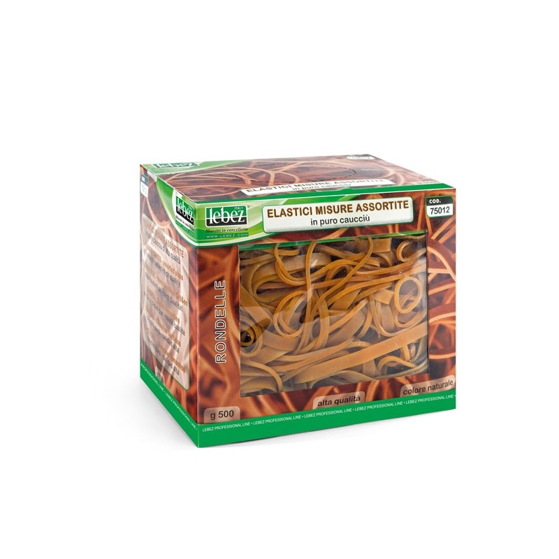 Elastici in puro caucciù a rondella e a fascetta in misure assortite. Scatola da 500gr.