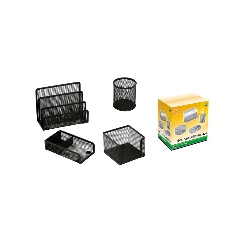 Set scrivania in rete metallica, composto da 4 accessori: sparticarte, cubo portamemo, portapenne e portafermagli.