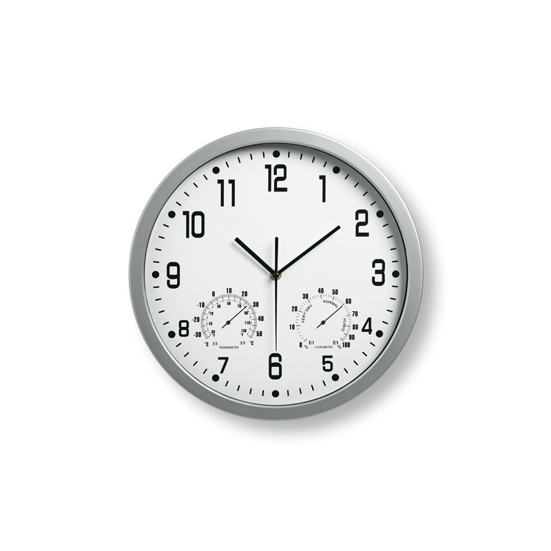 Orologio da parete in ABS con igrometro e indicatore di temperatura, funzionamento a batteria (non inclusa). Diametro 35 x 4 cm. Orologio non dotato di meccanismo silenzioso.