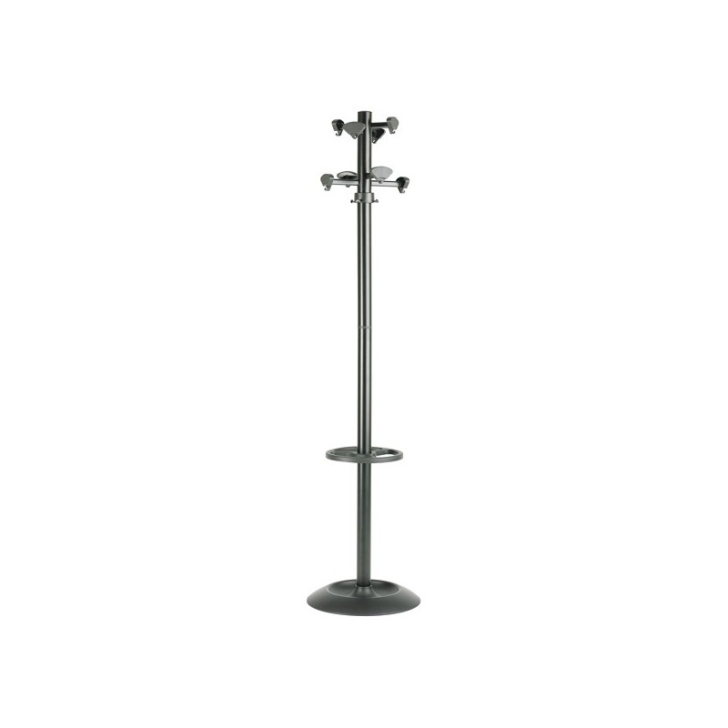 Appendiabiti da terra con stelo in metallo. Base in plastica con vaschetta raccogligocce. Dotato di 8 supporti e portaombrelli. Testa girevole. Dimensioni: 175x39cm