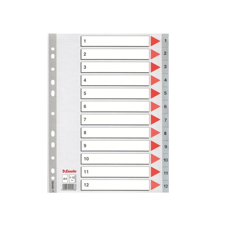 Separatori in PPL grigio da 115micron e tasti stampati da 1-12. Indice frontale prestampato in cartoncino. Foratura universale. Formato A4 maxi 22,5x29,7cm .